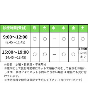 予防接種の予約は前日までに電話での申込みが原則ですが、急ぎの場合は当日でもワクチン在庫があれば受け付けていますので電話でご相談ください。予防接種専用の時間帯は12:00からとなっていますが、希望があれば診療時間帯でも可能となっています。