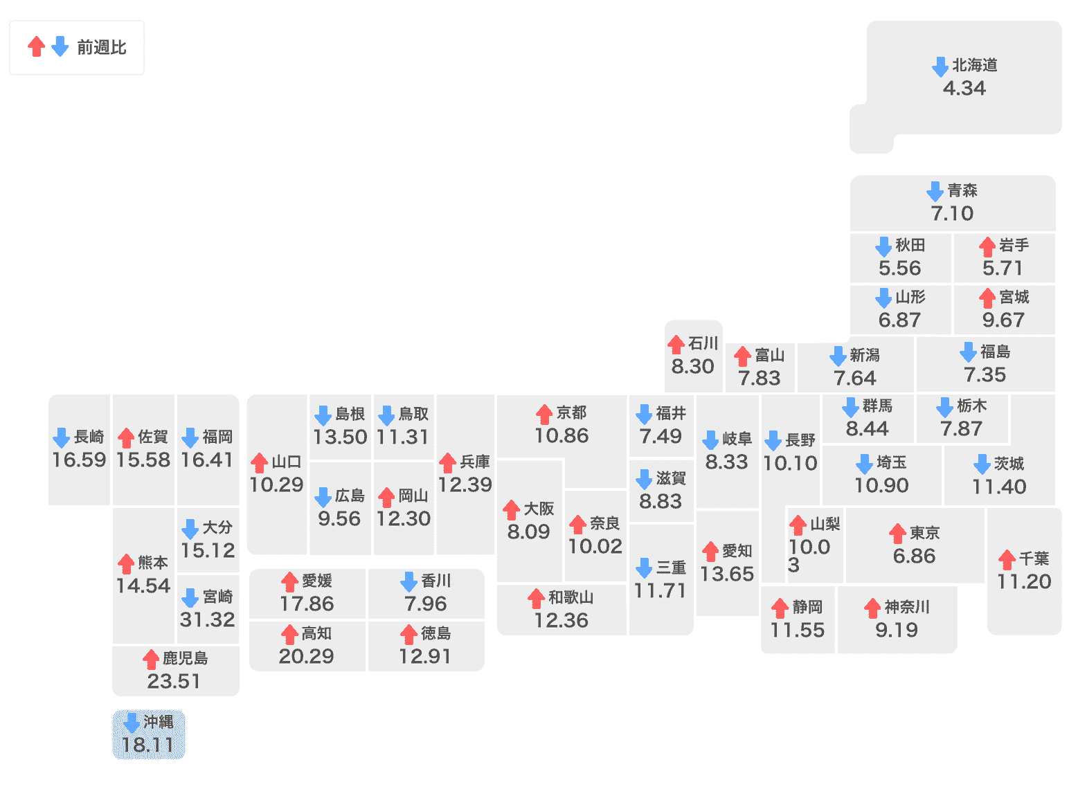 ※全国区は週遅れのため第2週のデータに基づいています。第3週では前述のように沖縄県の患者数は再び増加しています。