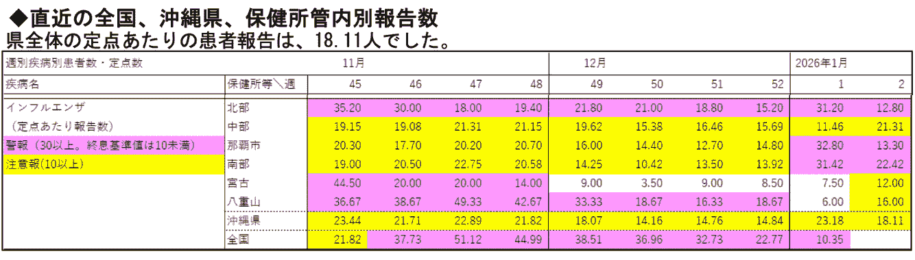 | インフルエンザ | ●●●● | やや増那覇市・南部地区で警報発令 |