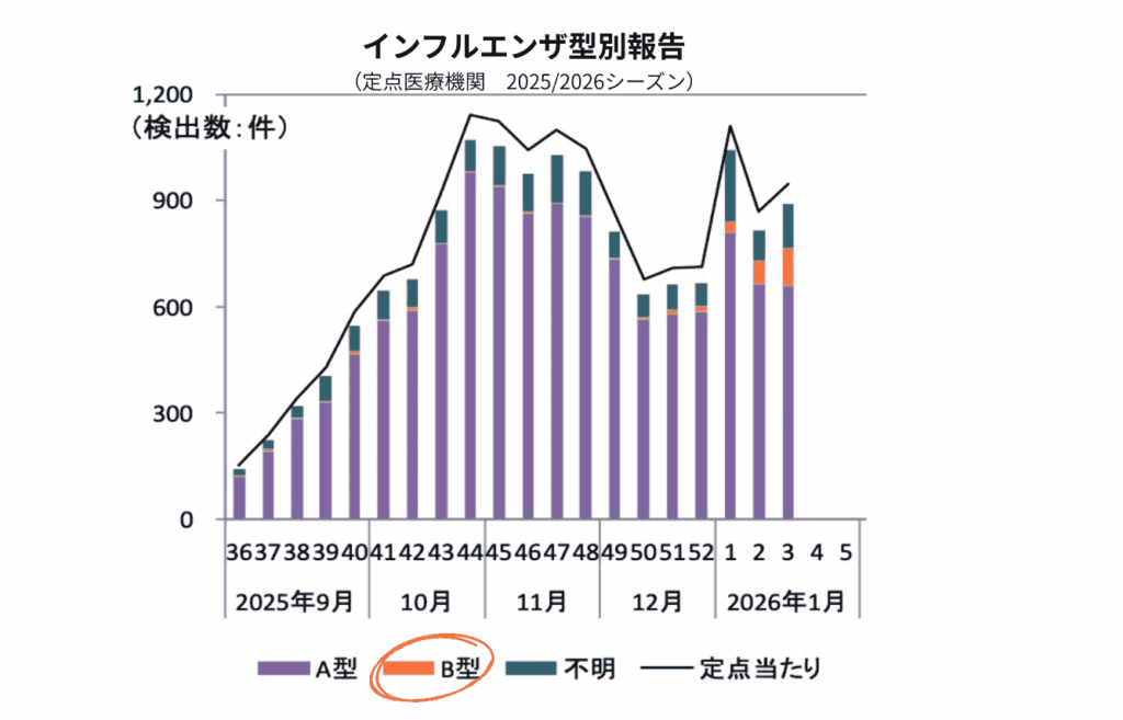 ただ、インフルエンザの型をみてみると、これまでほとんどがA型でしたが年末からB型がポツポツみられるようになり、年明けから少し増えてきているのがわかります。今回の患者増はB型の増加が影響しているのかもしれません。今後B型の増加がどうなるかによって状況が変わってくるかと思われます。(下の棒グラフ参照)