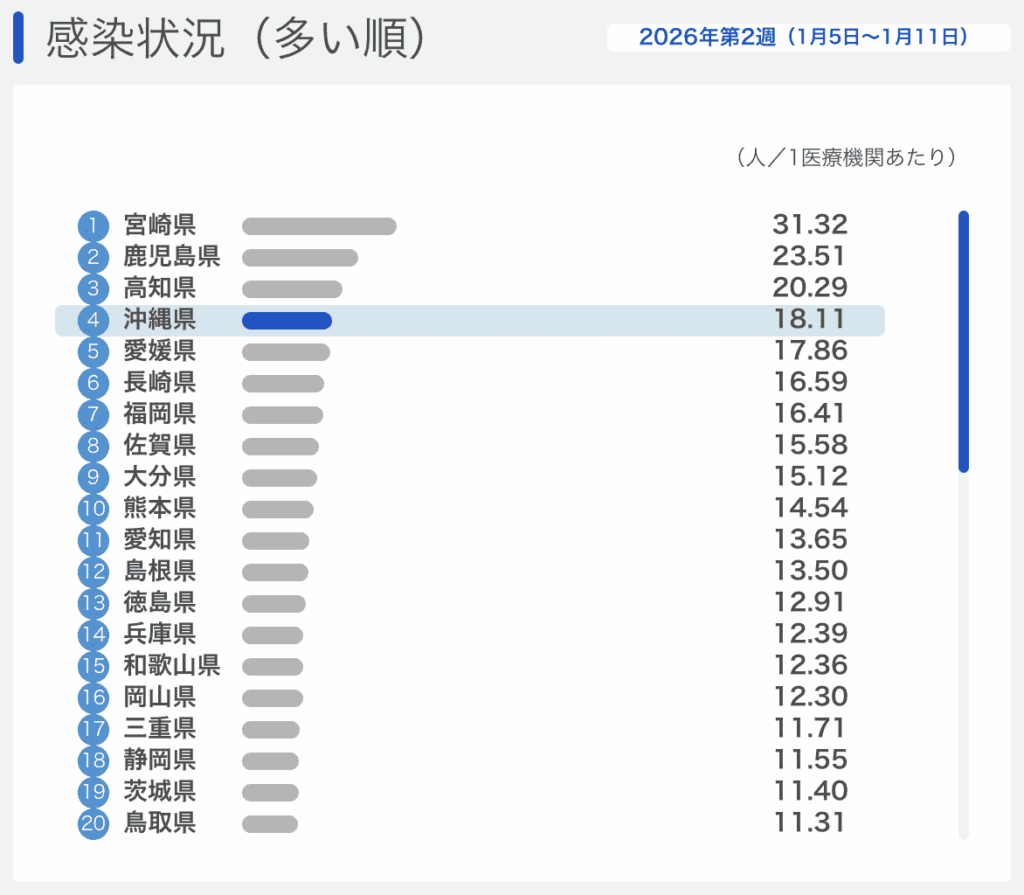 沖縄を除く多くの都道府県で患者数は少なくなってきており、沖縄県は患者数でも前週同様、全国で上位になってきました。(下表)