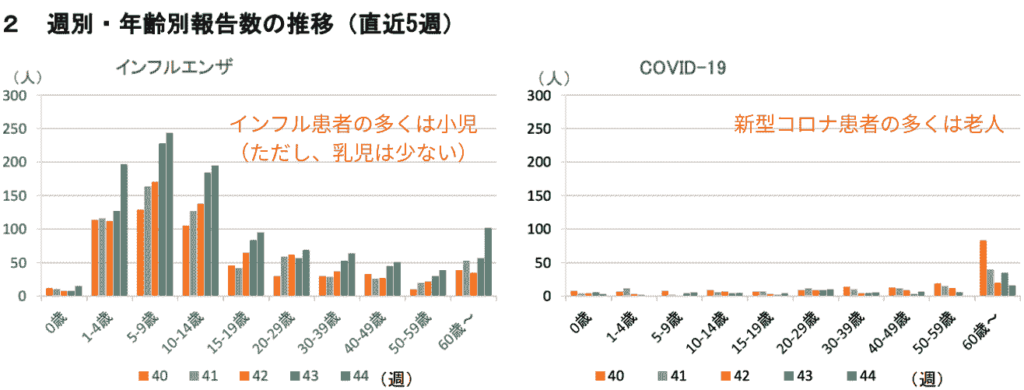 先週(43週)同様、コロナと対照的にインフルエンザはまだまだ増加中です。患者の年齢分布もコロナとインフレエンザは対照的です。コロナは老人が圧倒的に多く、インフルエンザは5〜9才を中心とした小児が多くなっている状況も同じです。(ただし、乳児は少ない。)