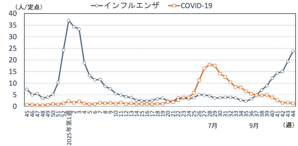 ※数値などのデータは44週(10/27~11/2)時点での状況です。統計データは集計のため1~2週間の遅れがあります。それらのデータ、プラス直近1週間の実際の診療現場での個人的な感想を加えた形での報告ですのであくまで参考程度に読んでください。