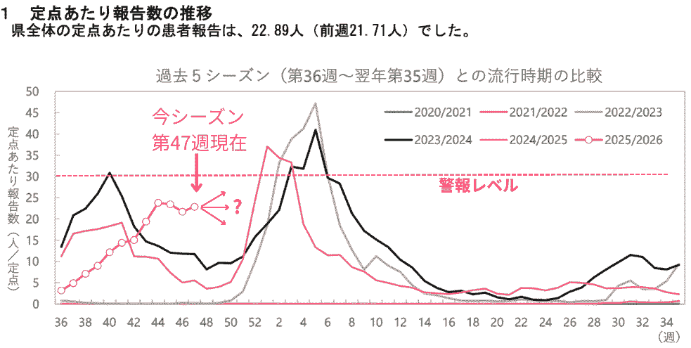 沖縄県のデータをみると、9月から増加し始め、10月に入って「注意報」の基準を超え、11月になっても依然増加であったが、第45週は増加が止まり、第46週(11/10〜16)にはわずかに減少している。このまま減少が続くのかと思われたが、今週(第47週(11/17〜23))になって再び微増となっている。