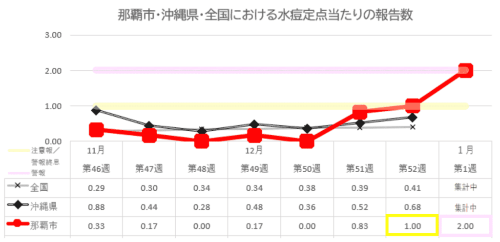 | 水ぼうそう | 横ばい ※最新情報では那覇地区で警報発令 | |