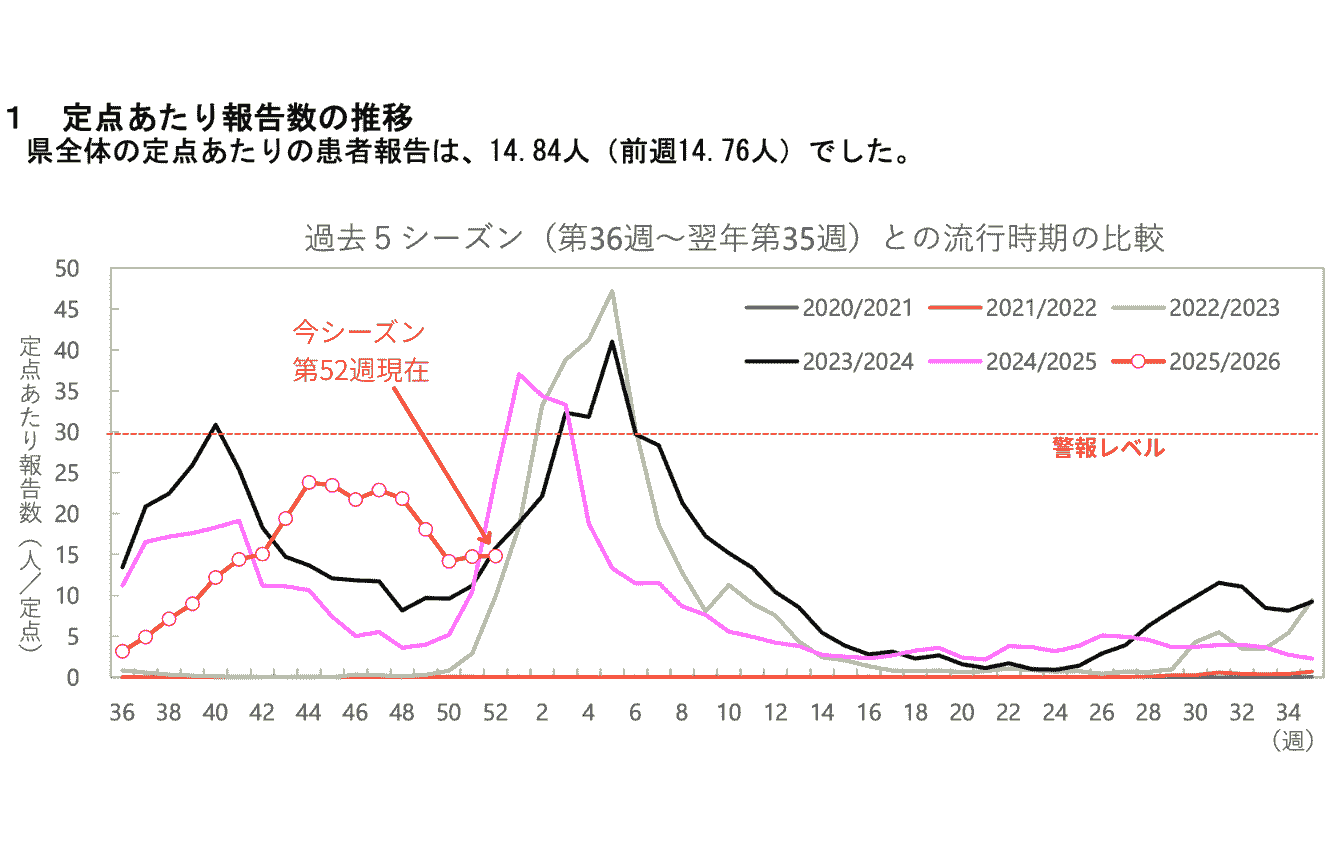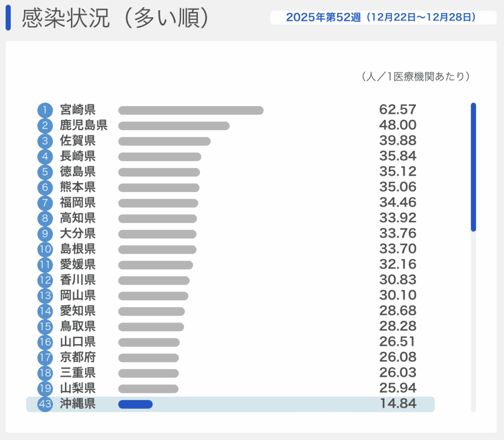 沖縄県のデータをみると、9月から増加し始め、10月に入って「注意報」の基準を超え、11月になっても依然増続けていましたが、第46・47・48週(11/10〜30)をピークに下降に転じています。ただ第50週(12/8〜12/14)より減少が止まり第51、52週(12/15〜28)と横ばい(からやや増加)となっています。