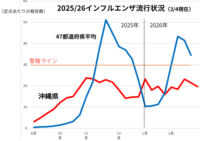 沖縄県のデータをみると、これまで述べたように年末年始から一時急増し(地区によっては)警報レベルとなりましたが、その後上下動していましたが、第8,9週になって減少傾向が続いています。(下の折れ線グラフ参照)