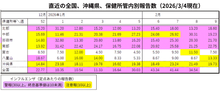 沖縄県感染症情報センターからの週末の定期報告(今年の第9週報)が発表されました。